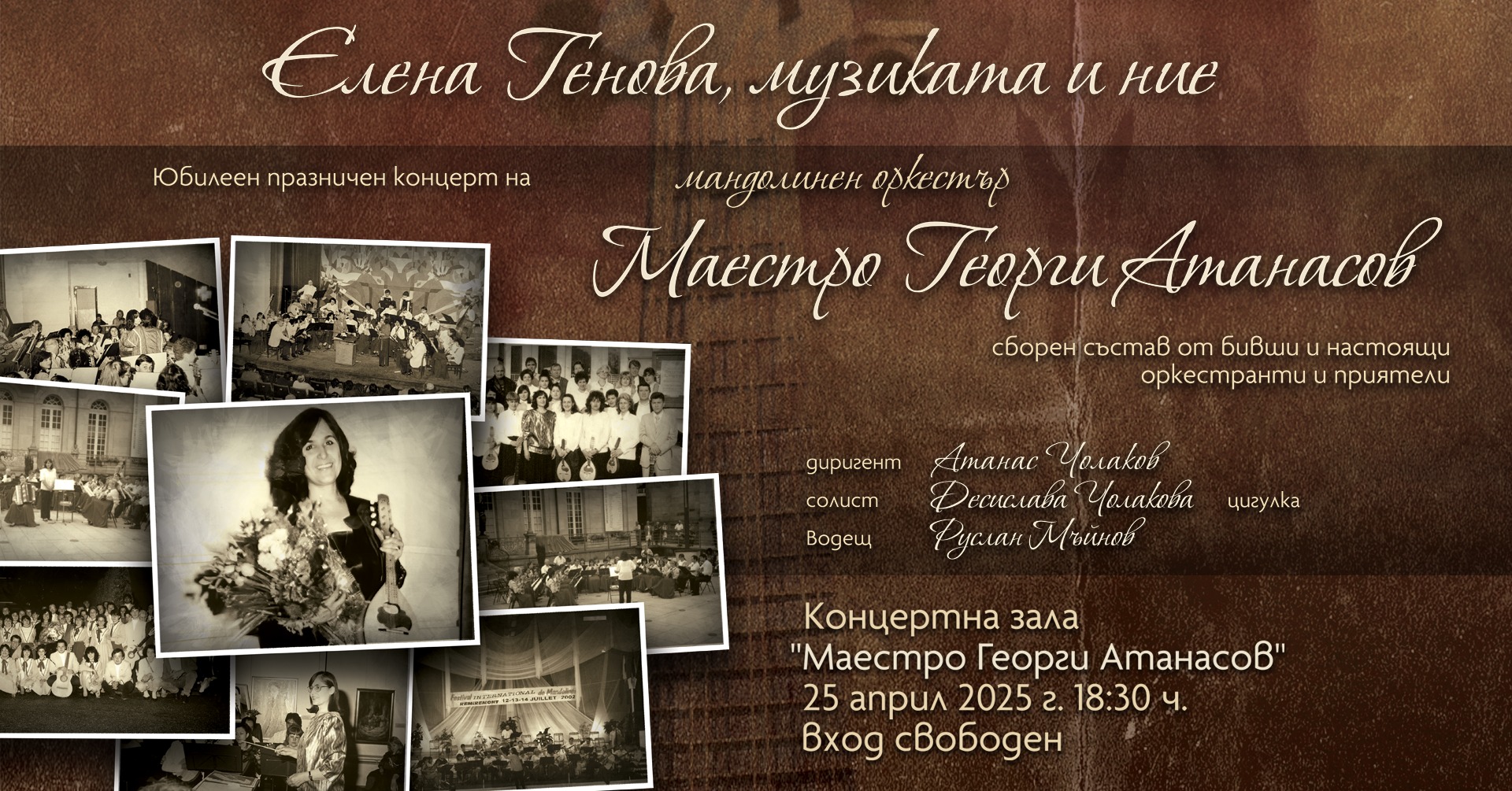 Празничен мандолинен концерт, посветен на създателя на Мандолинен оркестър „Маестро Георги Атанасов“-гр. Пазарджик, Елена Генова – ще събере на една сцена бивши и настоящи оркестранти, концертирали под диригентската ѝпалка. Уникалното по рода си музикално събитие ще представи пред пазарджишката публика произведения от български и чужди автори, част от репертоара на оркестъра през последните близо 50 години.