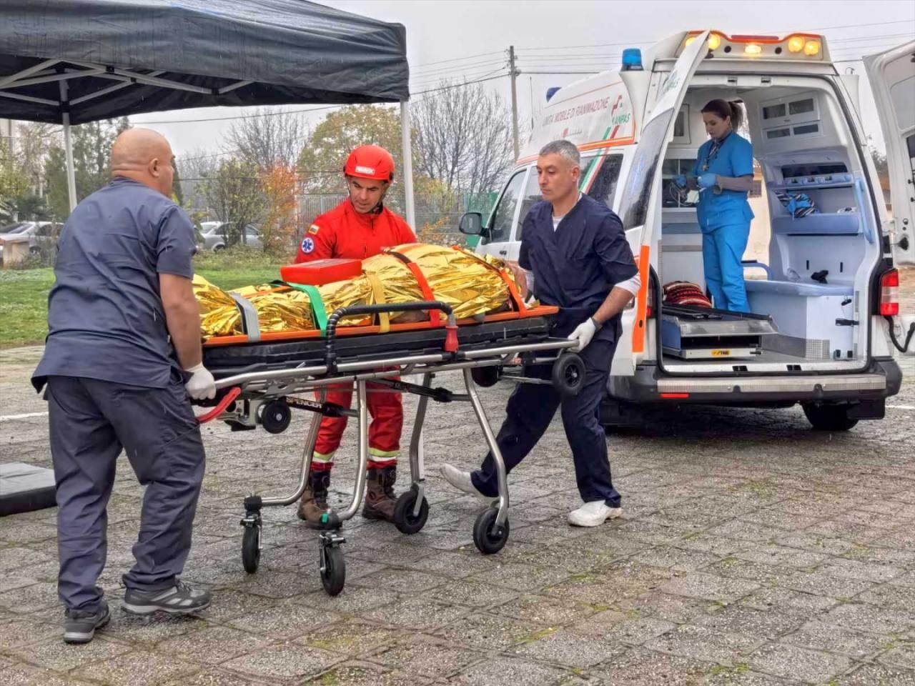 с термо одеяло и транспортирането му до линейка, която да го отведе в