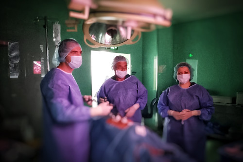 Екипът хирурзи, начело с д-р Кемал Аликов, извършва сложна комбинирана лапароскопска интервенция като първо отстранява жлъчния мехур. След това при строг протокол за безопасност пристъпва към обработката на кистата и изолира оперативното поле със специални сколицидни марлени ленти, за да предотврати разпространение.